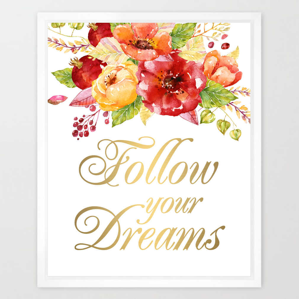 Eleville 8X10 Follow your dreams Real Gold Foil and Floral Contemporary Watercolor Art Print