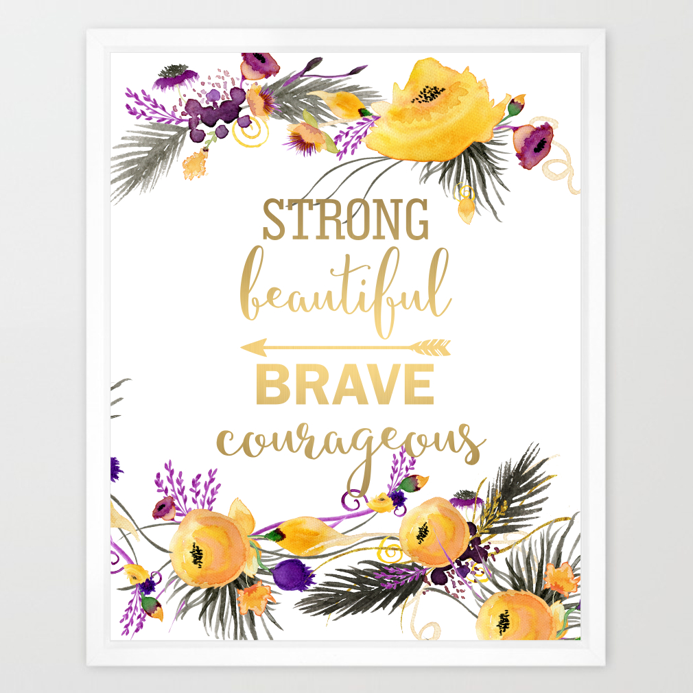 Eleville 8X10 Strong beautiful brave courageous Real Gold Foil and Floral Contemporary Watercolor Art Print