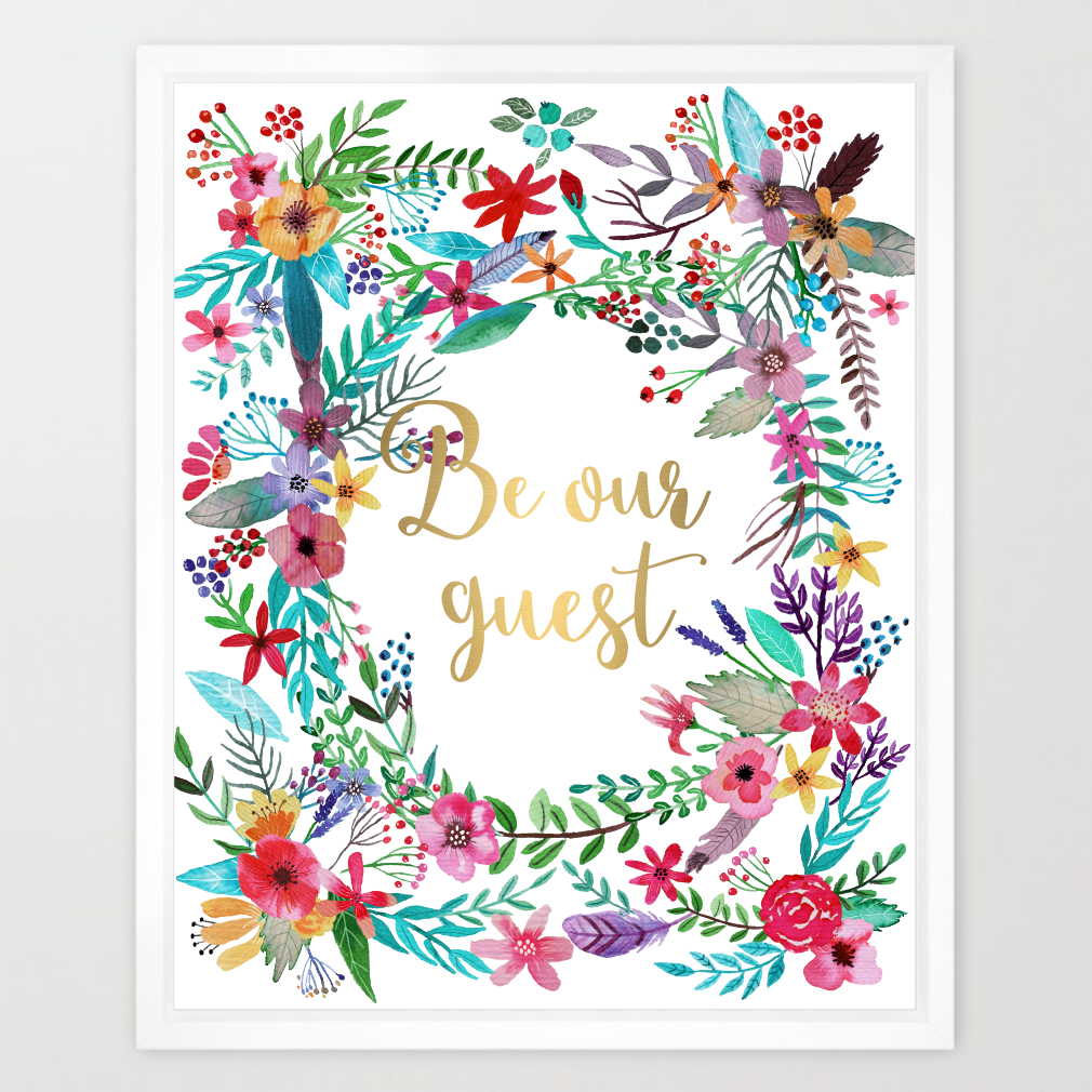 Eleville 8X10 Be our guest Real Gold Foil and Floral Contemporary Watercolor Art Print